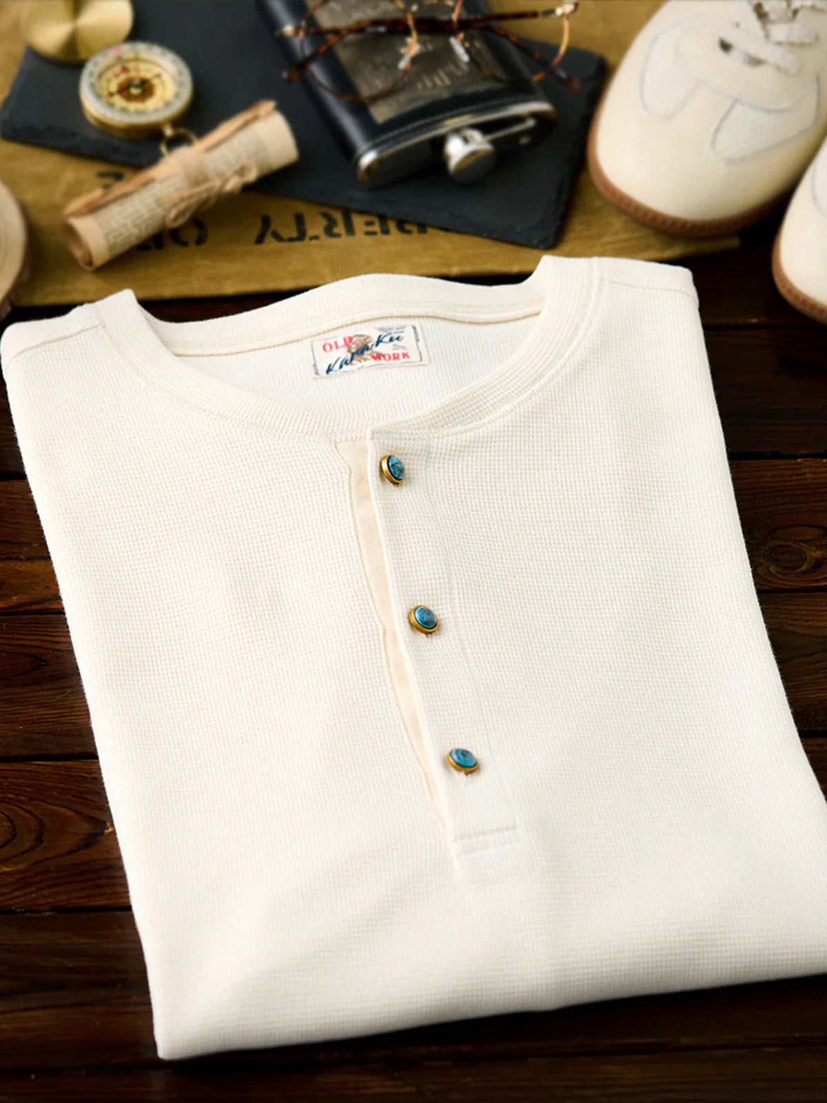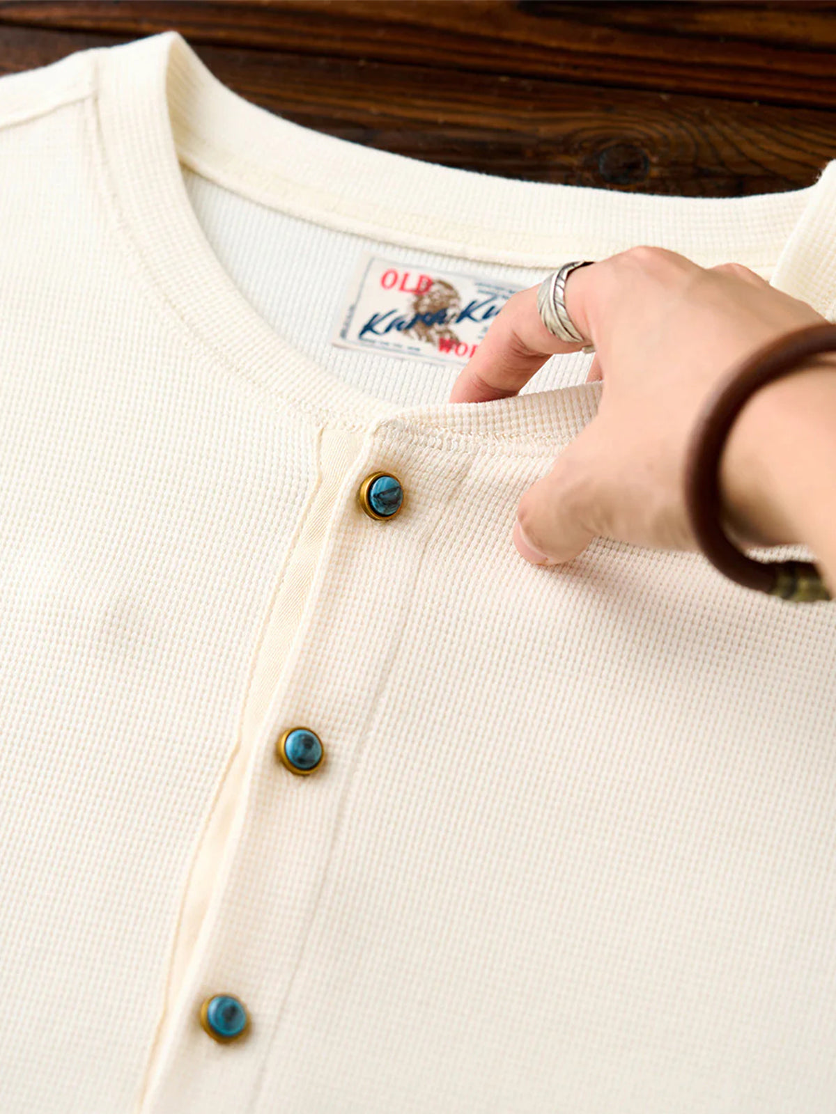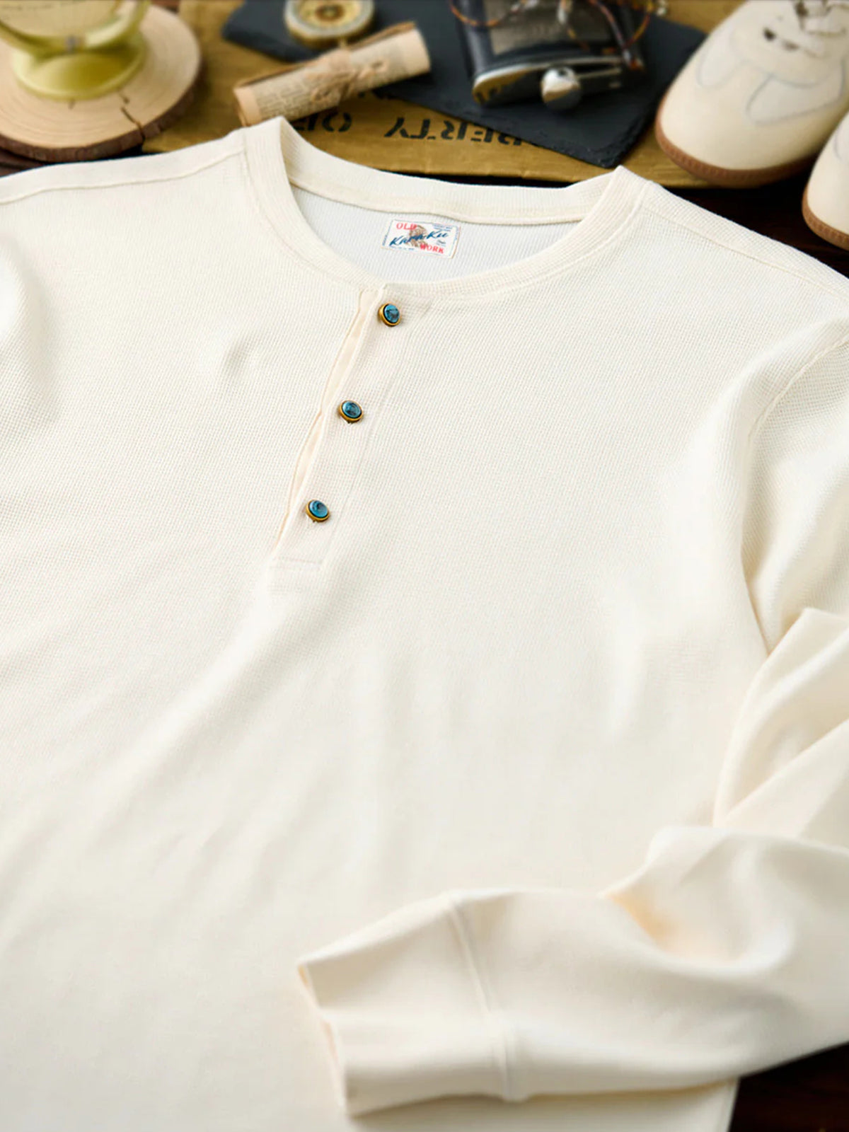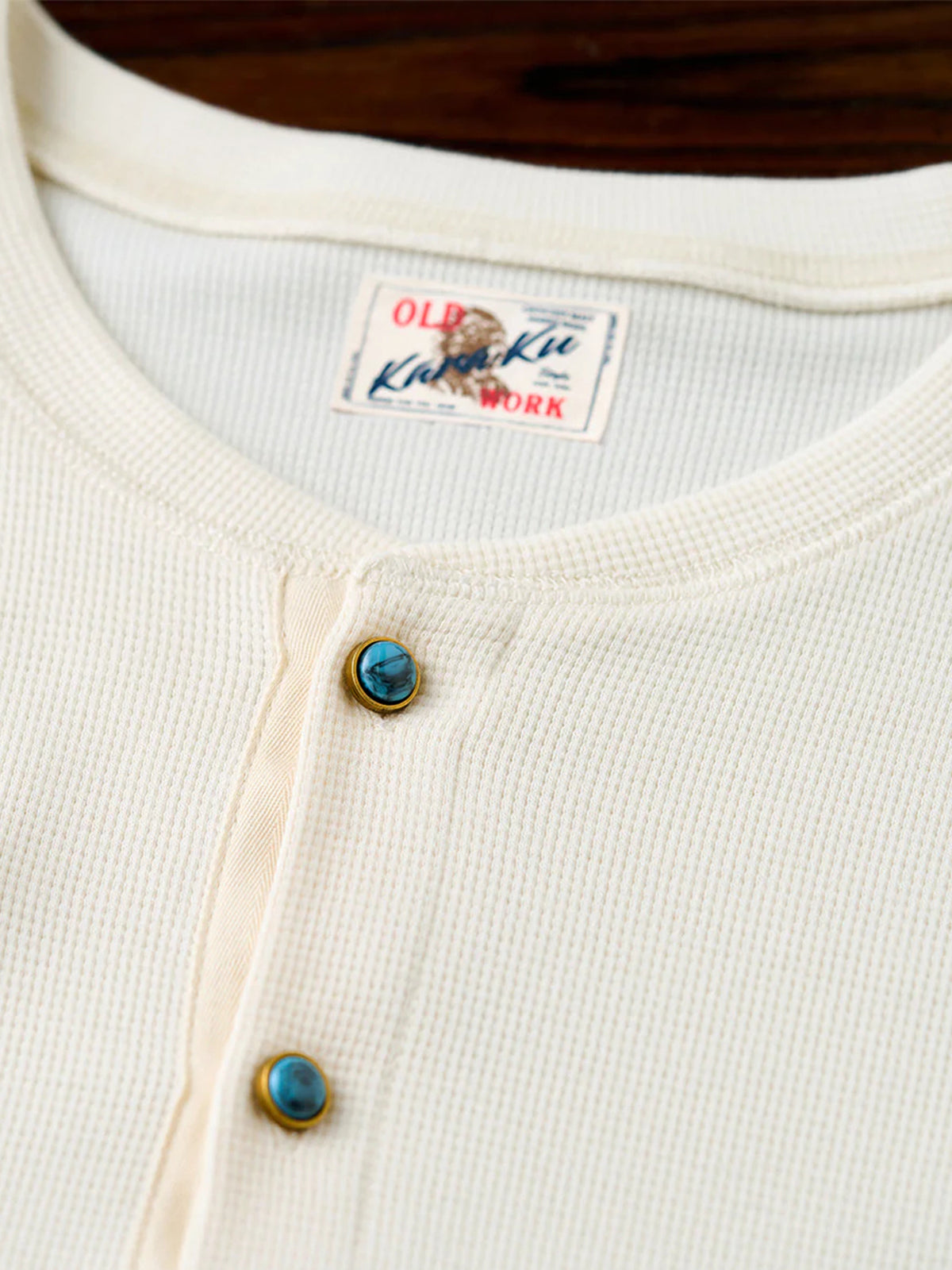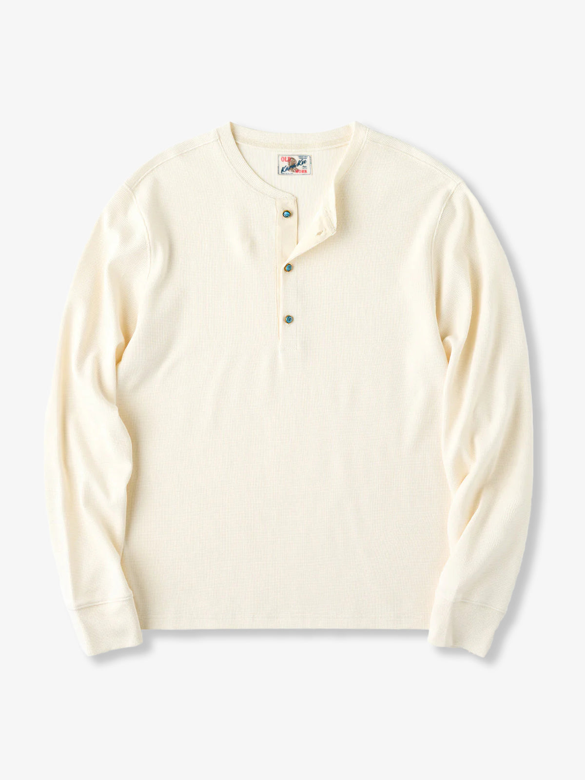 Waffle Henley Neck Long Sleeve T-Shirt with Turquoise-Style 3 Buttons