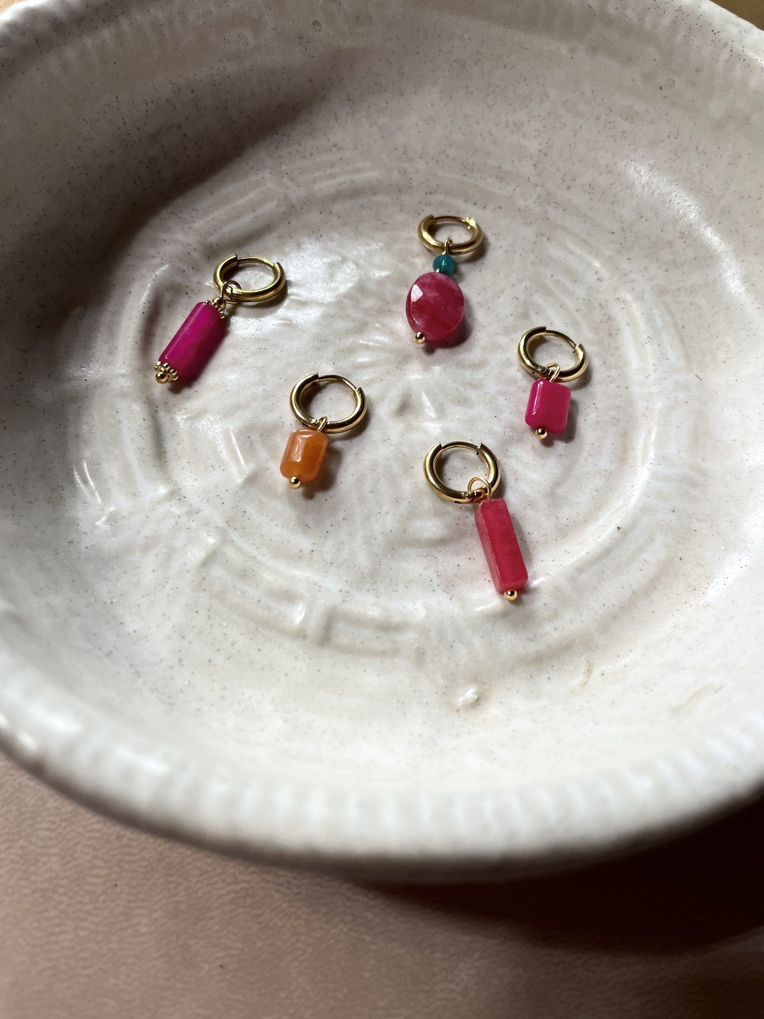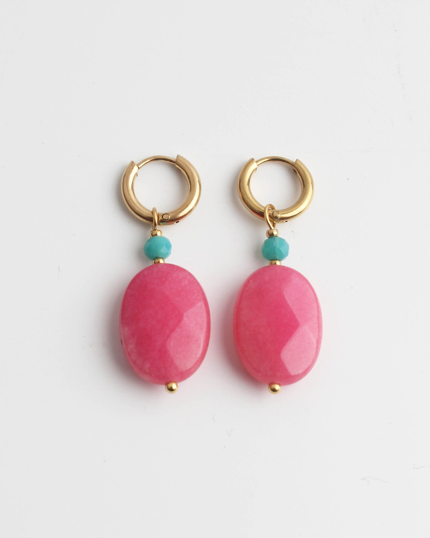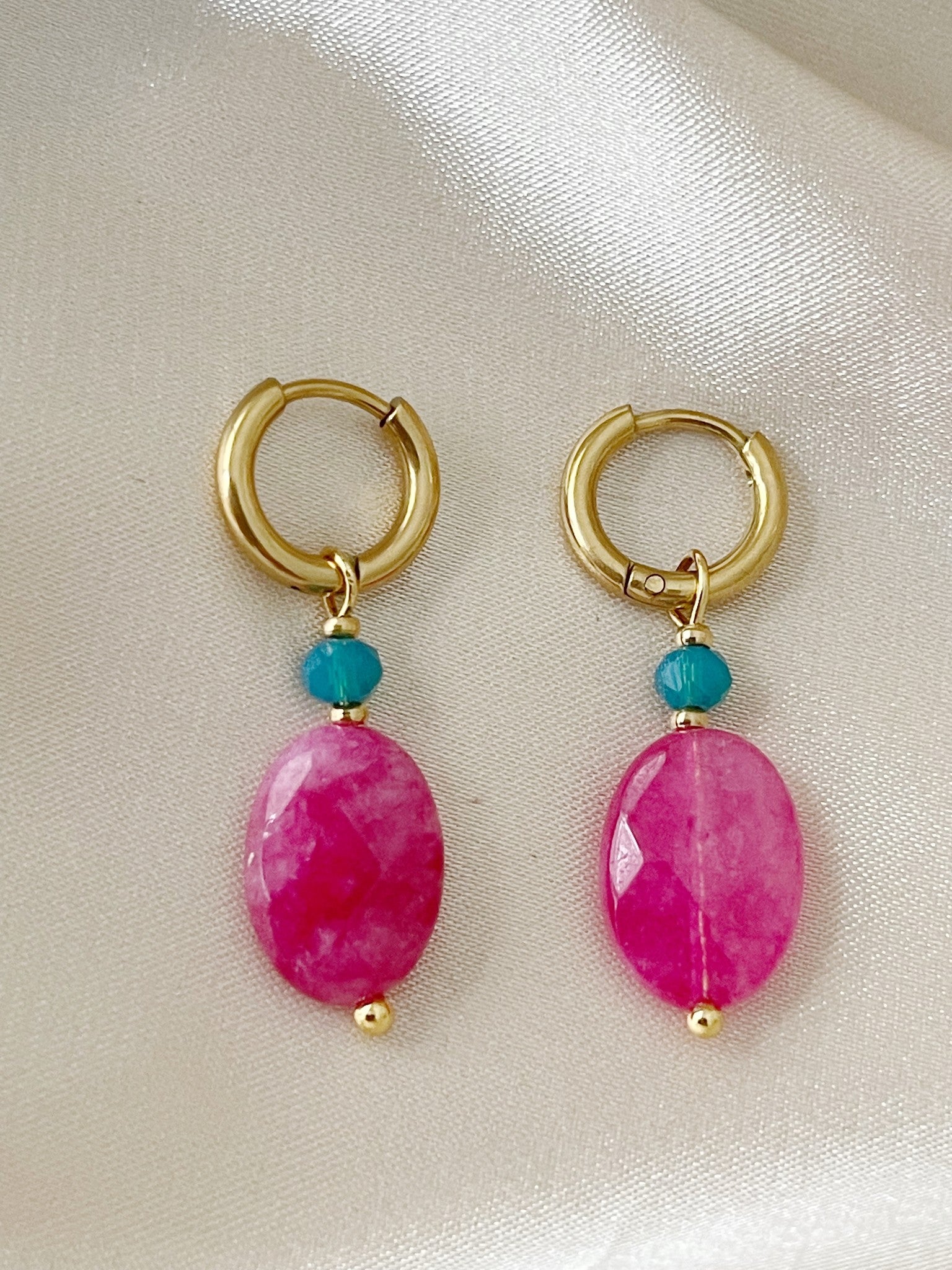 Prachtige oorbelletjes met roze natuursteen en een blauw, klein steentje. Dit setje is heel leuk te combineren met onze andere items en heeft een luxe uitstraling. Gemaakt van stainless steel (waterbestendig). Verkocht als set van twee.